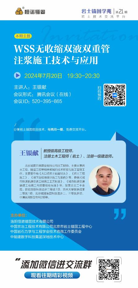 巖土錨固學(xué)苑將于2024年7月20日(周六)19:30-20:30舉辦第21期,本期主題:WSS無(wú)收縮雙液雙重管注漿施工技術(shù)與應(yīng)用,歡迎廣大巖土錨固領(lǐng)域愛(ài)好者參與交流。