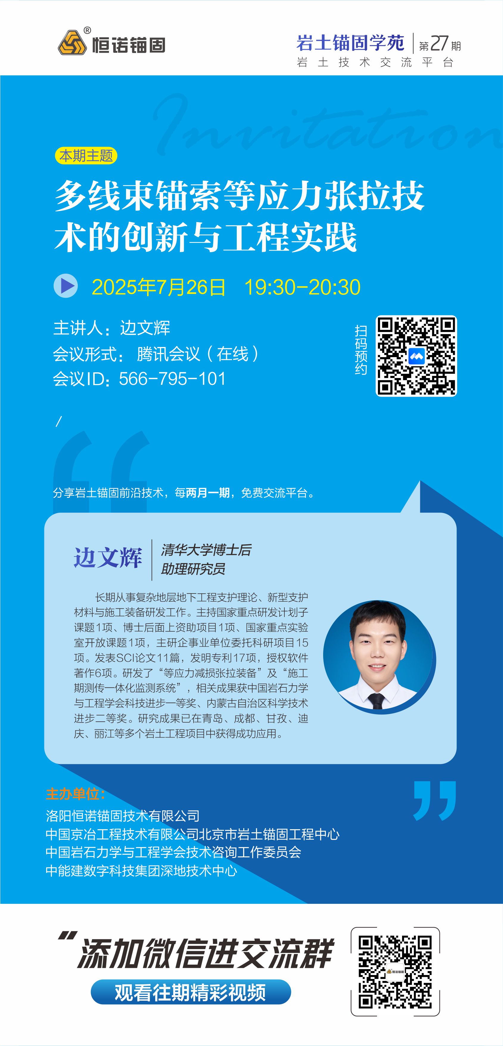 • 巖土錨固學苑將于2025年7月26日(周六)19:30-20:30舉辦第27期,本期主題:多線束錨索等應力張拉技術的創新與工程實踐,歡迎廣大巖土錨固領域愛好者參與交流。