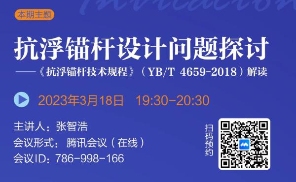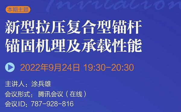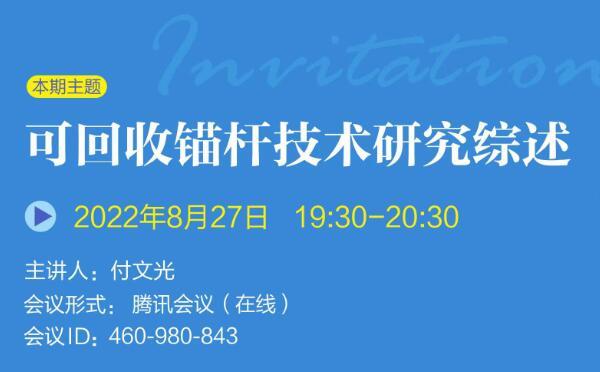 發(fā)布日期:2022-09-19 09:55巖土錨固學(xué)苑將于2022年8月27日(周六)19:30-20:30舉辦第期,本期主題:可回收錨桿技術(shù)研究綜述,歡迎廣大巖土錨固領(lǐng)域愛(ài)好者參與交流。 會(huì)議形式:騰訊會(huì)議(在線......