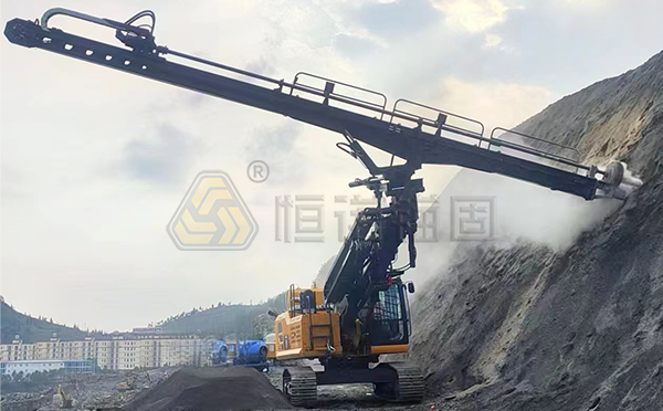 高舉鉆機舉升高度在9-40米,采用整體集成結構,由行走系統、動力系統、液壓操控系統、舉升系統和鉆進系統五大部分組成。高舉鉆機可以搭配不同動力頭,用以匹配不同施工工藝的鉆進施工,如潛孔鉆進、跟管鉆進、螺旋鉆進、頂錘方式鉆進等。高舉鉆機主要適用于鐵路、公路、水電站等大型高邊坡支護、危巖體加固工程,或大型隧道工程施工使用。